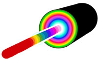 The images on the left are 'artistic' presentations indicating with the colors of the spectrum and the inverse colors several 'fields' in the Universe. Also the descending effect (spin 2, 1, 1/2) can be found in the presentation. In the middle is a different angled channel indicating the central movements, and symbolically the 'created' time-related level. The two oppositional 'areas' in our Universe: our world and the anti-world (e.g. quarks and anti-quarks) are mixed in this image, but they will be mainly positioned in different tube-zone after the remains of the annihilation. |