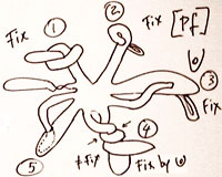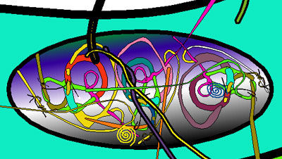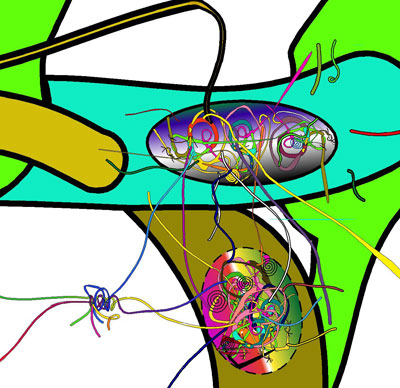 There are several ways tubes can interact on all different levels. The image on your left can be inverse in such a way that those actions happen inside a sphere. A combination of both is of course also possible. Such lasting or temporal connections can happen between tubes of different levels (e.g. T2 [P] T5), tubes for different dimensions (e.g. T3x [P] T4z), tubes for different tube-zones (e.g. T11g [P] T26z). The number of possible combinations is infinite. Your might think that this is an abstract exercise but this happens also on your kitchen level when you are cooking the eggs. And when you are swallowing them. ;-). It might be interesting to visualize the difference between a dimension and a tube-zone (but we can discuss about that). |