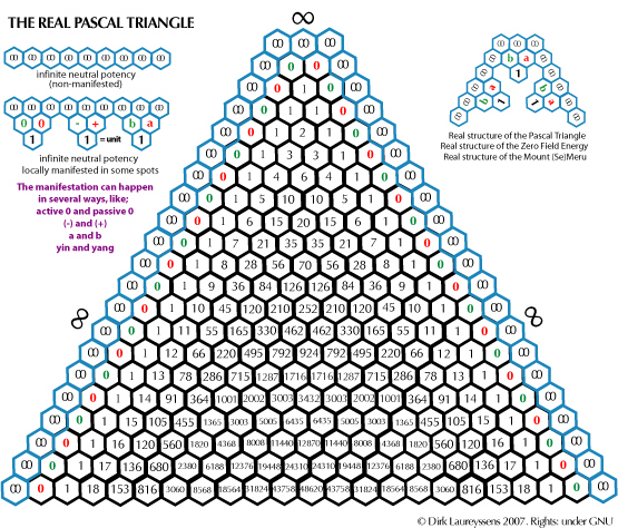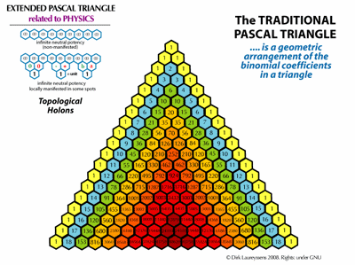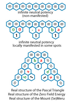 When we combine this new information we can state that till now we had a wrong idea about the real Pascal Triangle. From the understanding that there is one background field (which Tesla called: The Field of Force) that we call the membrane, we say that there is infinite neutral energy, called the Zero Field Energy. Puthoff calls it wrongly the Zero Point Energy. The zero field energy (ZFE) can create locally holons. These holons can be seen as abstract units in mathematical sense, also energetically as entangled dynamic forces, also as spaces in cosmology and as fundamental particles. When we put this general idea in a diagram which will relate to the Pascal's Triangle we get this images: | ||||||||||||||||||