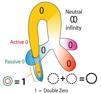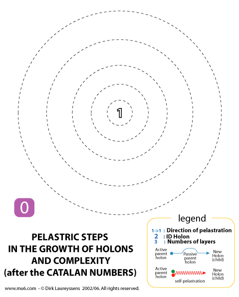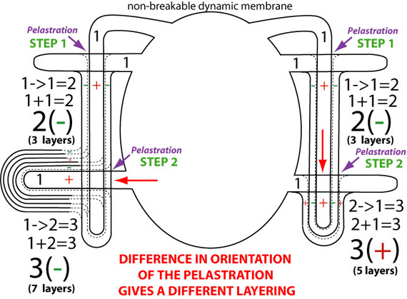 The first One that you see here is however a enigma in mathematics. What is 1^0? There are different opinions between mathematicians. In the Pelastratic approach this enigmatic first One is composed by two zero's (two background membrane peaks), making a new union that has three layers. That gives next picture: | ||||||||||||||||||
