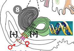 In Tube nr 8 the green area symbolizes the Genes and DNA coming from the parents. Don't forget that in this design only ONE line will make the full design, because there is only ONE membrane that makes ALL (like one paper-sheet in Origami). By the basic membrane everything is interconnected.