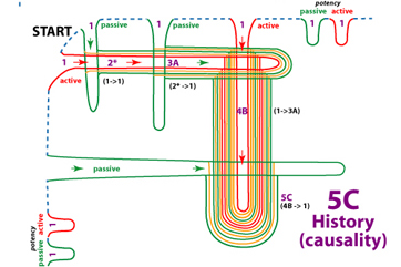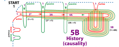 Another aspect that 3A shows here is that 5A can only decay IFF (if and only if) holon 4A withdraws. In next holon 5B we will see that the holon will decay instantly when an active peak (red) is withdraw. That is an important aspect when we examine chemical reactions with the holon approach. |
