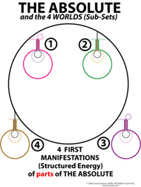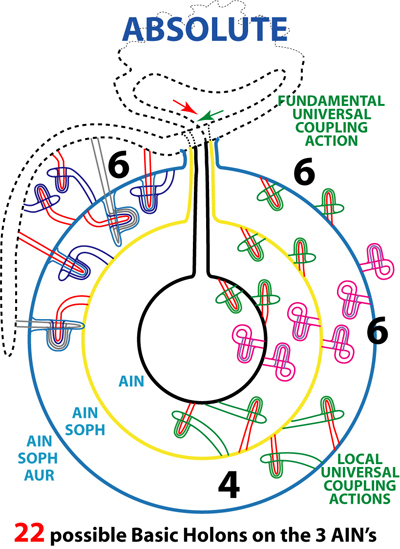 In each of these four worlds dynamic interactions happen. They are caused by the dynamics of superiour membrane. On and/or between these three Ain-layers of each world - and still powered by the Absolute and still being Membrane - a chain of progressive more complex sub-holons can be "made" by pelastrations. Next image shows that there are 22 possible sub-holons possible. |