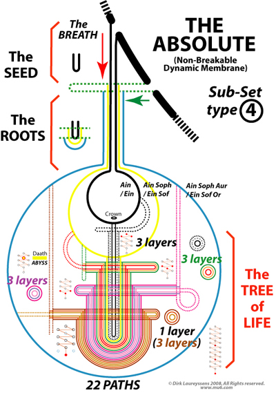In the holon realm the Tree can be seen as a union of dynamic multilayered tubes which start from one or more of the Ain-layers, and where these tubes - by progressing - receive more and more layers. The penetration through the Ain Soph layer by the three superior sefirot (together one three-layered tube) gives an extra cover over this tube with is then called Daath (the Abyss), or the secret sefira. We looking from below cannot see behind.