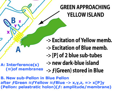 Now the blue membrane (in the center) represents: the notion: 'WHITE'. The new excitation by the yellow membrane vibrations will create interference vibrations in the blue membrane and create this way thousands of tiny sub-blue-membrane tubes. Some of these sub-tubes will couple. This way an ASSOCIATION is made inside the blue area of WHITE + SNOW.