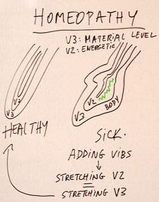 For example: Homeopathy. Dr. Hahneman started to observe how a pure tincture (V3) made healthy persons (V3) sick. Then dilutions (V2) were made to see when the sympthoms disappeared. Homeopathy dilutions are made by vibrating sequentially (in a fixed pattern) solutions till there are almost no molecules inside, even no molecules at all (D12-20). Such dilutions work on non-materials levels (V2) in the sick body (V3). When the added vibrations on level V2 stretch level 2 in the correct way, the body V3 will also stretch.