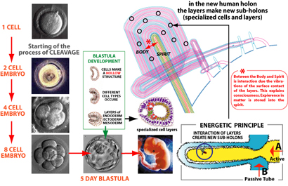 | Now the zygote is unitied with the re-incarnated spirit. The spirit and cell are still isolated by a pure membrane, but they ar compressed together. By this compression they move together. And the mind and cell interacts by surface vibrations. If the spirit vibrates also the cell vibrates, and when the cell vibrates these vibrations are also felt in the spirit. In fact it's a very simple process of exchange of vibrations (oscillations). Now the cell starts to divide in a process called cleavage. |