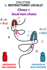 In de tekening hiernaast ziet de rode waarnemer enkel de holons die in het rode universum verschijnen. Van 'gebeurtenissen' in het blauwe universum kan hij enkel 'soms' onverklaarbare effecten zien (tengevolge van de 'deformatie' van het spacetime membraan.