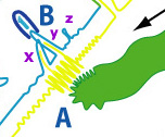 Hier zien we hoe een groen holon het oppervlak van de gele holon exciteert waarop de extra oscillaties van het gele spacetime membrane een nieuwe blauwe holon verwerken in een binnen-membraan van het gele holon. Dit is hoe bv. Kennis-holons ontstaan. |