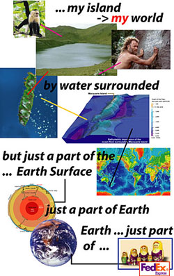 Voor een waarnemer op het eiland is het bijna zijn volledige wereld, en gelden er daar een aantal regels waaraan hun onderworpen is. Alles wat op dat eiland groeit komt eigenlijk van het samenspel van de aarde (deze top van de aardkorst) en het water. Je kunt dus zeggen dat alle planten, dieren en bewoners een deel zijn van de aarde en het water. Alles is eigenlijk 'geherstructureerde' aardkorst/water. De eilandbewoner beseft niet dat zijn eiland slechts een top is. Hij heeft geen OVERZICHT.