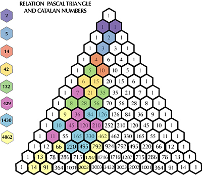 Now this type of unique combinations reached by pelastrations (creating unique holons) is exactly the combinations shown by the CATALAN numbers. The Catalan numbers (1, 2, 5, 14, 42, 132, 429, 1430, 4862, 16796, 58786, 208012, 742900, 2674440, 9694845, ...), named after Eugène Charles Catalan (1814--1894), arise in a number of problems in combinatorics.