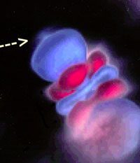 This image, obtained by ASU solid state scientists Jian-Min Zuo, Miyoung Kim, Michael O'Keefe and John Spence using electron and x-ray diffraction techniques, represents the first time the covalent bonds between atoms have ever been "seen" in cuprite. The nuclei of the copper atoms (not shown) are at the center of the blue and red shaded orbitals and those of the oxygen atoms (also not visible) are at the center and corners of the superimposed cube. The fuzzy pink clouds are less defined electron clouds representing covalent bonds between the copper atoms -- metal to metal bonding. In the second image (Cu202.tif), superimposed red circles represent the locations of oxygen nuclei.
