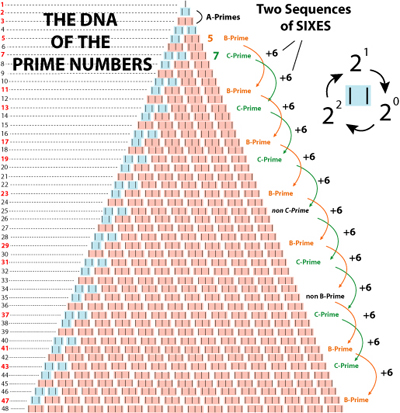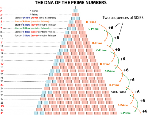 De DNA van de priemgetallen Sedert 2000 jaar zoekt men naar wat priemgetallen eigenlijk zijn. Men gaat er steeds van uit dat het één reeks van unieke getallen is waarbij elk priemgetal enkel deelbaar is door zichzelf en door 1. Dat is juist, maar ... het is niet slechts één reeks. Het zijn in werkelijkheid twee - quasi parallele - reeksen van getallen. Wij kunnen dus van een soort DNA spreken. Op elke reeks liggen SPECIFIEKE priemgetallen. Eén van die reeksen begint van het getal 5, en de andere begint van het getal 7. Vanuit 5 én 7 worden dan steeds cycli van 6 bijgevoegd, dus steeds een opbouw met zes nieuwe eenheden. TWEE REEKSEN (de B-reeks en d C-reeks) Ik noem de reeks die met 5 begint de B-reeks. De B-priemgetallen liggen op een reeks die begint bij 5 en vervolgens wordt er sedert 6 bijgeteld. Dat geeft: 5, 11, 17, 23, 29, 35, 41, 47, 53, 59, 65, 71, ... Deze samengestelde nummers kunnen eruit gehaald worden via een reeks eenvoudige berekeningen, bv. voor de B-reeks : 5 + 30 + 30 + 30 + 30 + ... enz, , 11 + 66 + 66 + 66 + enz, 35 + 42 + 42 + 42 + enz. , 65 + 78 + 78 + 78 + ... enz. Voor de C-reeks zijn de "eliminatie reeksen" bijna hetzelfde, bv. 25 + 30 + 30 + 30 + ..., 7 + 42 + 42 + 42 + ..., 55 + 66 + 66 + 66 + 66 + ..., 85 + 102 + 102 + 102 + ... Deze eliminatie reeksen geven "samengestelde getallen", dus geen priemgetallen. De eliminatie-reeksen worden dan afgetrokken van de B en C-reeksen, en zo blijven enkel de echte priemgetallen over. Onze hypothese is dat zulke eliminatie reeksen continu blijven. Wellicht kunnen er wel unieke nieuwe combinaties gevormd worden, maar dat moet via sterke computers gecontroleerd worden. Bv. bij nieuwe priemgetallen die tijdens de opbouw worden gecreeërd. Met het relatief sterke computerprogramma Mathematica hebben wij onze stelling reeds berekend, en geen fouten gevonden. Duimen dus! ;-) Wel, als wij getallen als louter tweeën en drieën bekijken zien wij dat ALLE getallen met 2-en en/of 3-en kunnen beschreven worden. Dit is wellicht tegen onze dagdagelijkse logika maar toch kan men het ook zo bekijken. Hierna ziet U een driehoek (ongeveer de Driehoek van Pascal) die louter uit enen (I, II, III, IIII, ...) bestaat. De blauwe zones vormen een twee (2) en de rode zones een drie (3). Wij zien dat er weinig tweeën voorkomen, en zien zelfs dat er een cyclische beweging inzit bij de (blauwe) twee. Ook zien wij dat de priemgetallen in twee reeksen van zessen verdeeld zijn. Er zijn dus twee verschillende reeksen waarin STEEDS priemgetallen voorkomen. (ps: alle getallen kunnen bv. ook louter met 2,3 en 4 worden opgebouwd maar wij verkiezen voor onze analyse enkel 2 en 3)