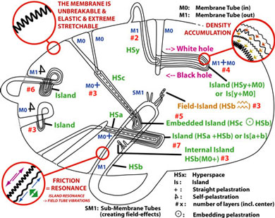 Next to that the membrane can create 'locally' also new tiny tubes which will act as membrane tentacles vibrating after the overhaul frequency of that specific island. We can call these outer-island tubes: Field tubes (because they represent the electro-magnetic and radiation fields). Because the layers press upon each other they create 'tension', thus DENSITY. This way the various combinations between energy and matter are explained. The shift between energy and matter happens thus as follows: couple (white hole/pellon of A+B)-> de-couple (Black hole separation A and B) -> re-couple (New white hole/pellon A+X) and/or (new white hole/pellon B+Y). The Big Tube or Membrane sub-divides itself by pelastrations in trillions of other tube-zones and inter- and intra-dimensional tubes. This process of creation can happen simultaneous on the MACRO- and MICRO-cosmic LEVEL. Pelastration is an essential dynamic process to explain the creation of dimensions, matter and energy, motion, etc. and several joining activities, but is not the only process. Sub-tubes (such as the field-tubes) - resulting from the pelastration of several types of tubes - can also coil, knot, etc. with other tubes and provoking changes of conditions. For example by coiling they can create temporary conditions (joined resonance by joined connection) to attract (in fact capture) symbiotic other tubes (compare it with human reproduction). Another type of resonance is however also created by internal friction or over-heating of one or more layers in a tube-zone or the entry of new tubes (e.ge. adding new strings to the piano). The embedding of another 'micro-island' will influence the overhaul frequency.