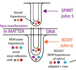 The Spiritual holon of John 5 has in the has a number of internal spiritual sub-holons (symbolized by: green star, yellow hexagon, red circle) which are internal couplings of that membrane. This happens like knowledge is stored. Then John 6 concepts by the combination of the DNA of the two parents. The moment of the conception the Spirit of John 5 couples with the matter instructions of the DNA. A new human holon called John Smart is started, and grows.