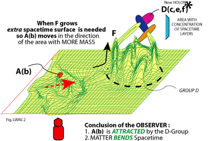 (2) When the D-group moves (you tear on the spacetime pillow or you move the group or one holons of the D-group ) ... also the single holon A(b) will move immediately in the direction in which the denser matter D-group goes. Isn't that the effect what we call GRAVITY?
