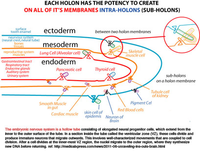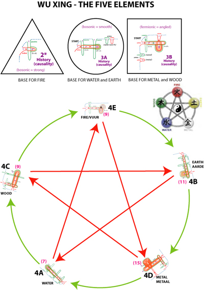 These five elements are each specific combinations of holons (membrane spaces). On the webpage holon growth are shown the various combination. The first basic holon-type is called 2*. Which can combine in two ways: as the holon-type 3A and type 3B (see webpage). Each of them can combine in a yang and a yin way. In total five combinations are possible, these are the five elements.