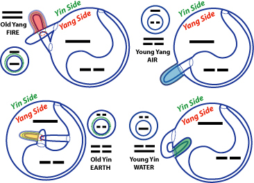 The combinations of Yin and Yang are symbolically expressed in the I Ching (Book of Changes) by 64 combinations of Yang (full line) and Yin (broken line) and offer basic frames (by Hexagrams) which are also used for divination.