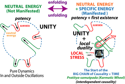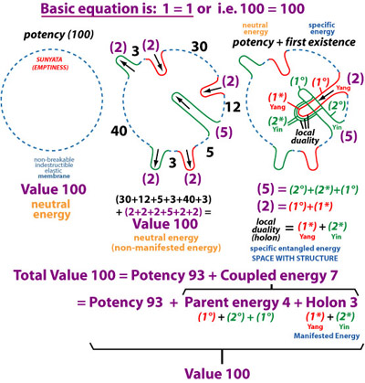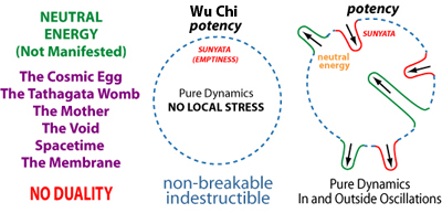 At this level the membrane is pure energy (cfr. Frank Wilczek), and is in a state of non-dual not-being (Wu Chi). The membrane has however the possibility or potency to restructure itself in sub-sets. This can happen when an active part of the membrane penetrates a passive part of the membrane, that way creating a local multi-layered space, which is a UNION (a co-existing yin part and yang part).